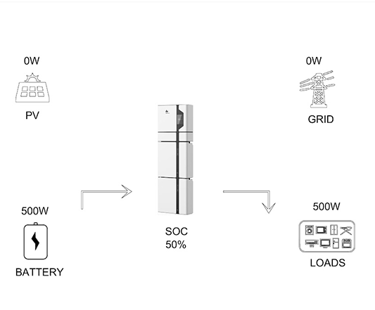 Everyone has gone to bed and you’re running a 1HP split-type AirCon in the master bedroom all night. The solar system has 50% charge in the batteries. Load is 500W since the AirCon is running in automatic energy saving mode. The inverter powers your load with battery power until it reaches the reserve threshold you define (i.e. 20%). Your meter is stopped since there’s no power flowing to/from the grid.