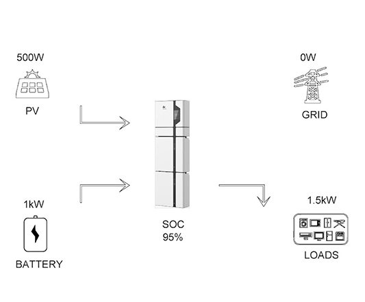 You get a 30 minute rain shower so the solar system is no able to run at it’s peak but the AirCon is still running. The solar system now only produces 500W, the battery is 95% charged. The inverter satisfies the 1.5kW load by taking 500W from the panels and 1kW from the batteries. It will continue to do so as long as the battery charge stays above the reserve threshold you define (i.e. 20%). Your meter is stopped since there’s no power flowing to/from the grid.