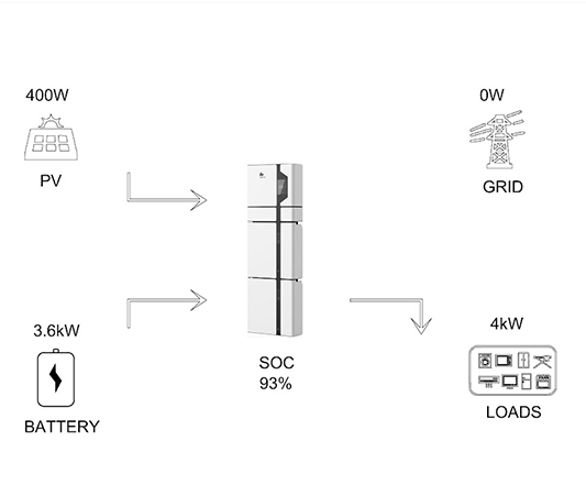 You return home and turn the AirCon on again. The solar system can only produce 400W since it’s late afternoon and the sun is not strong, the battery is 93% charged. Load is 4kW since someone is showering with an instant water heater and water pump is running. The inverter satisfies the 4kW load by taking 400W from the panels and 3.6kW from the batteries. It will continue to do so as long as the battery charge stays above the reserve threshold you define (i.e. 20%). Your meter is stopped since there’s no power flowing to/from the grid.